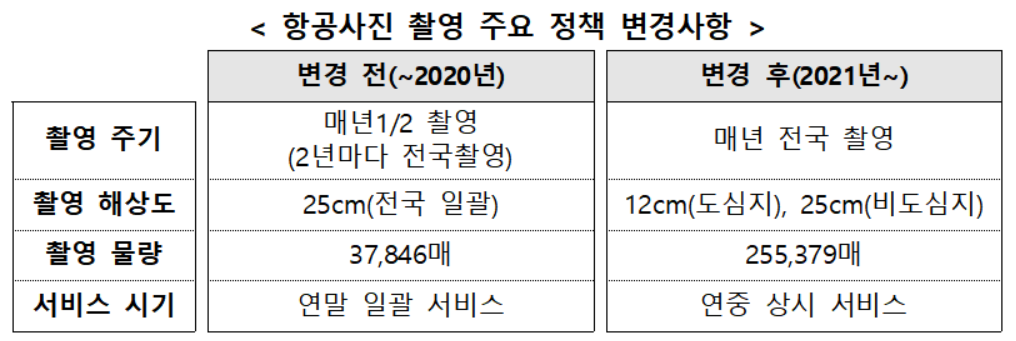 이러한 제도개선으로 민간에서는 다양한 포털사이트 영상지도의 당해연도 촬영 항공사진을 활용하여 서비스의 최신성을 확보 할 수 있고, 지자체에서는 불법 건축물 모니터링, 인ㆍ허가 및 토지관리 등 각종 행정업무를 더욱 신속ㆍ정확하게 지원할 수 있으며, 중앙행정기관에서는 당해연도 발생한 다양한 국토변화상을 국가기본도 등 각종 공간정보에 반영하여 빠르게 서비스 할 수 있을 것으로 예상된다.